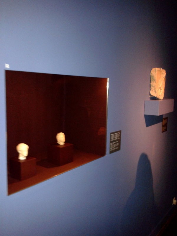 Je nach Objektart und Material sind die Vitrineninnefarbe angepasst. So strahlen auch diese kleinen Marmroköpfchen wunderbar in ihrer Vitrine.