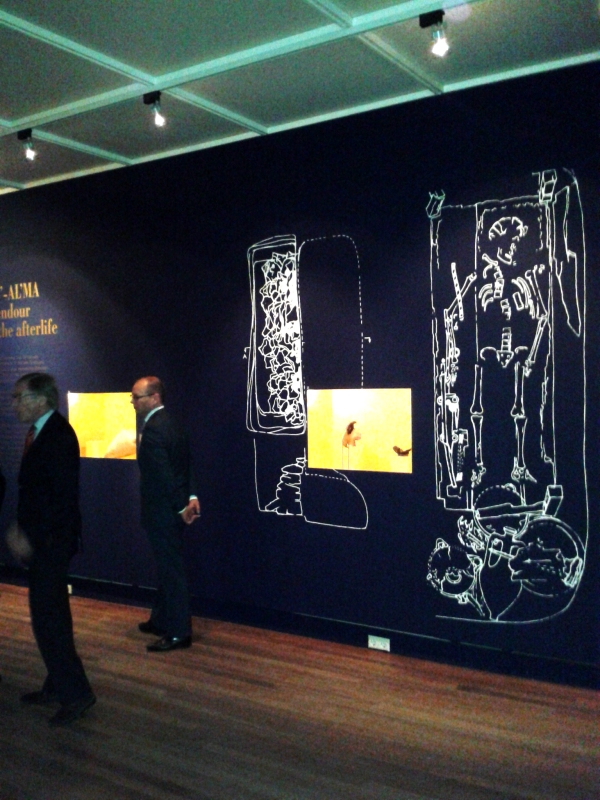 Auch an den Wänden befinden sich grafische Elemente, wie beispielsweise die Grabpläne – eine super Idee. Und die gelben Wandvitrinen enthalten diesmal die großartigen Holzobjekte.