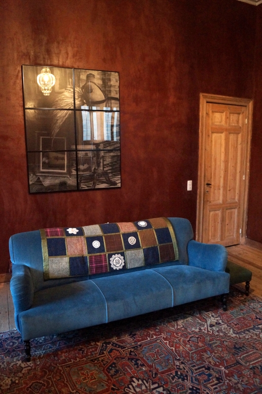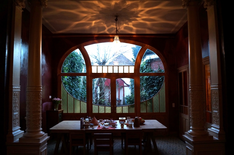Getoppt wird das schon tolle Zimmer aber absolut von dem Frühstücks- und Aufenthaltsraum. Vor einem wunderschönen alten Fenster wird an einem gut gedeckten riesigen Holztisch gefrühstückt.