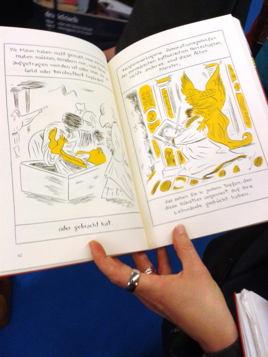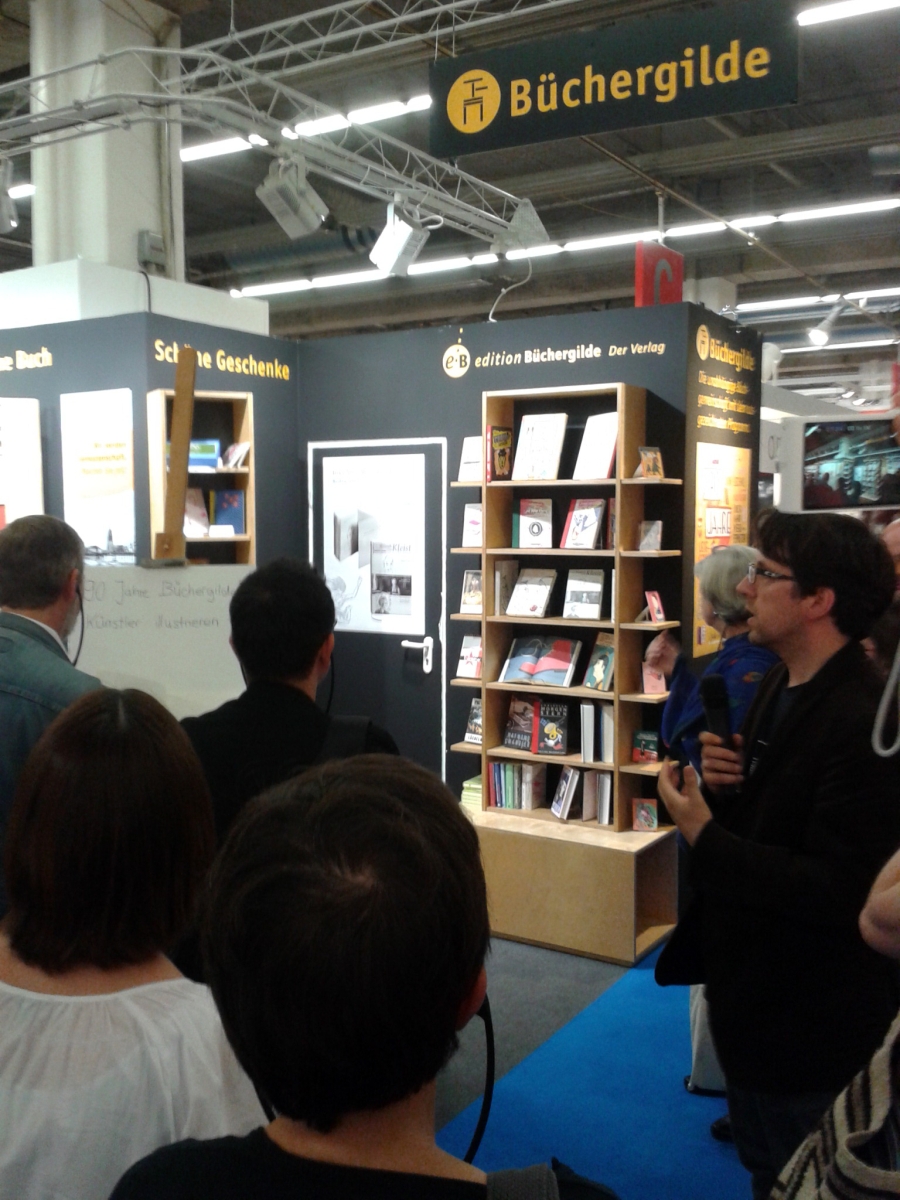 Das war eine wirklich gute Idee, dass jeder der Teilnehmer einmal durch die unterschiedlichen Graphic Novels blättern konnte und somit nicht nur die unterschiedlichen Formate sondern auch Gestaltungen direkt erfahren und ansehen konnte. Der erste Stand war Knesebeck, gefolgt von Büchergilde, Suhrkamp, Luftschacht, avant, Edition Moderne und natürlich Reprodukt. Diese Verlage waren alle in Halle 4.1. Danach ging es dann weiter in Halle 6. Es war ein spannender Rundgang und an jedem Stand entspann sich ein neuer Diskussionfaden, etwa über Verkaufszahlen, Handschriften in Comics und wie wird damit in Übersetzungen umgegangen und und und. Aber ein Autor schien an fast jedem Stand wieder aufzutauchen: Nicolas Mahler. Eine Art Vielzeichner, der aber sehr interessante und vor allem lustige Bücher macht. Ein paar davon landeten direkt auf meiner ToRead-Liste (z.B. „Alte Meister“ oder „Alice in Sussex“).