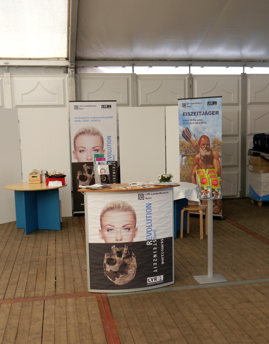 Vorletzten Samstag war der Tag der Begegnung in Köln. Der Tag der Begegnung ist Europas größtes Familienfest für Menschen mit und ohne Behinderung. Wir – das LVR-LandesMuseum – waren natürlich auch vor Ort. Ein Bericht dazu hat meine Kollegin auf dem Museumsblog veröffentlicht. Hier sind ein paar Eindrücke von unserem Stand. Irgendwann bin ich nicht mehr zum Fotografieren gekommen, da so viel zu tun war – das Interesse war riesig. Wir haben den Workshop “Steinzeit-Amulett” angeboten. Man konnte mit Naturmaterialien wie Muscheln, Leder, Holz und Rinde Ketten oder auch Schlüsselanhänger herstellen. Der Workshop war wirklich der Renner.