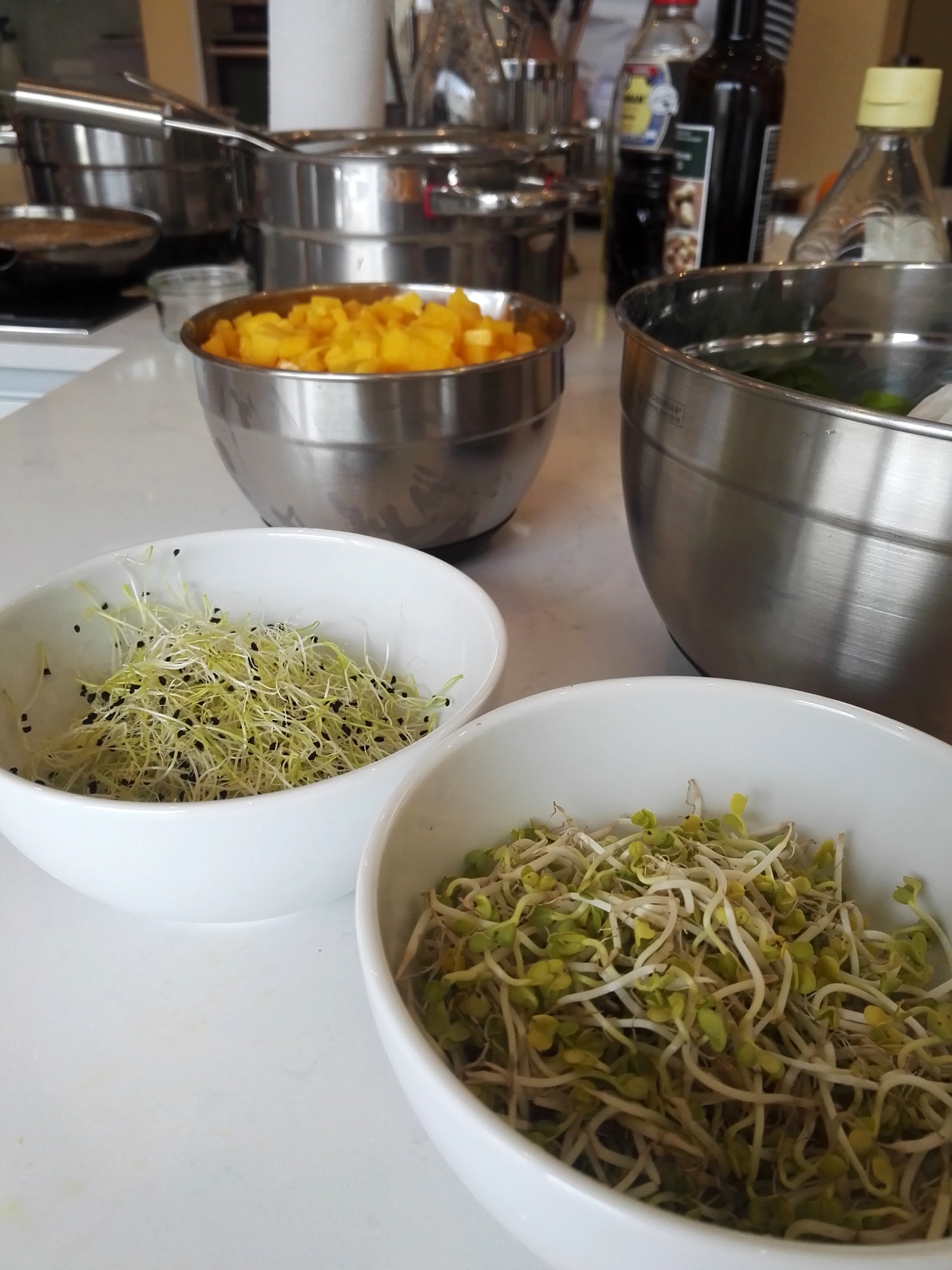 Es war eine lustige Truppe und wir hatten beim gemeinsamen Kochen reichlich Spaß. Getränke, wie Wasser, Wein, Bier gab es die ganze Zeit reichlich und für Zwischendurch war auch noch eine Probierstation für verschiedene Öle und Salze aufgebaut, die mindestens genauso faszinierend und lecker war. Besonders das schwarze Hawaii-Salz hat es mir angetan.