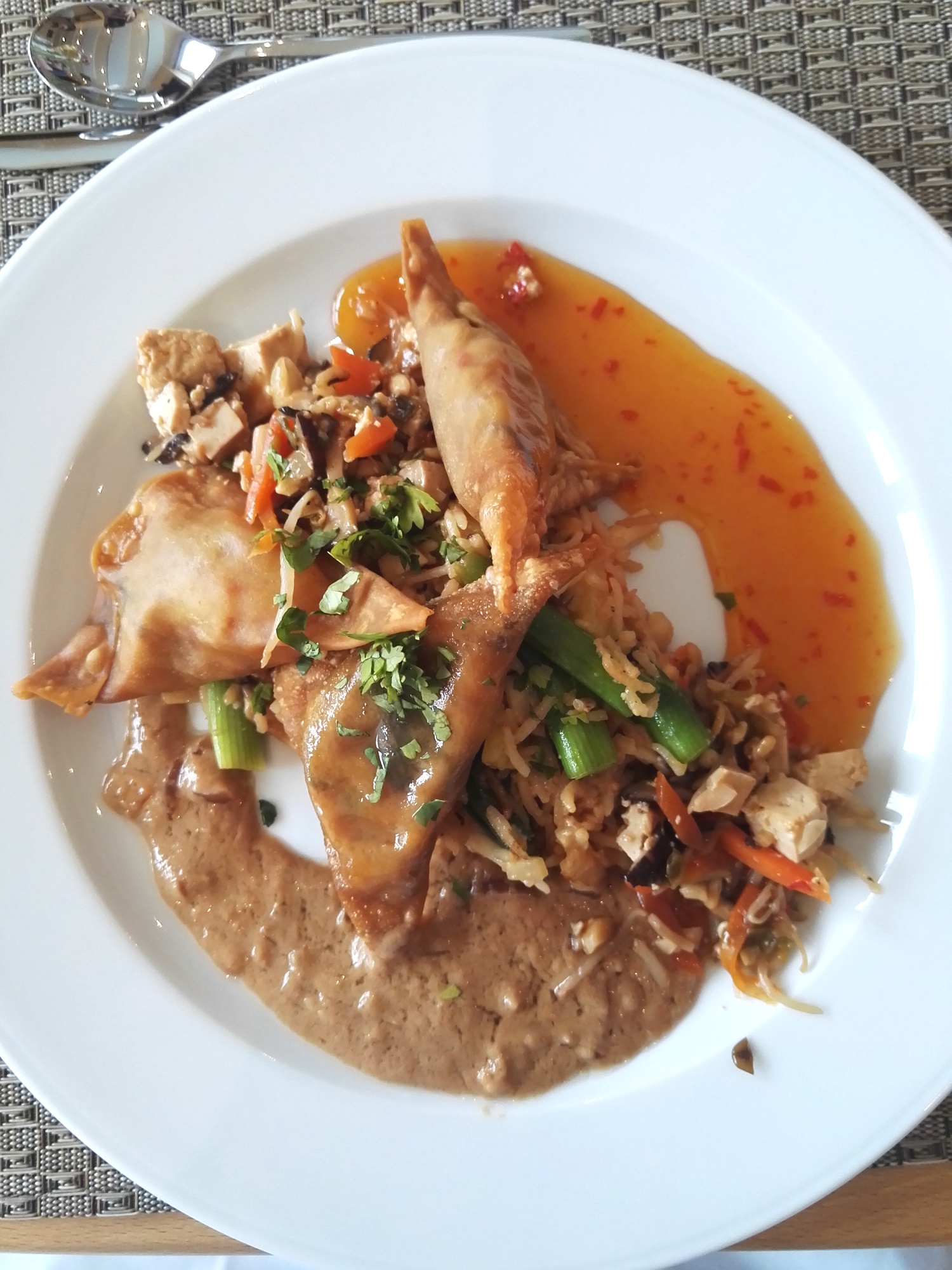 Und was soll ich sagen, es war alles „mjam“! Die Sommerrollen enthielten Shiitaki-Pilze. In der Rahmsuppe waren Äpfel und Bananen drin. Die WanTans waren gefüllt mit einer Gemüse-Tofu-Mischung und es gab eine sehr scharfe, aber sehr leckere Chilisauce und eine ebenso leckere Erdnusssauce dazu. Alles selbst im Team gekocht. Natürlich mit Profihilfe, aber trotzdem. Als Tüpfelchen auf dem i hatte das Ananasgratin auch noch eine Baiserhaube und in das Kokoseis hätten wir uns allesamt reinlegen können.