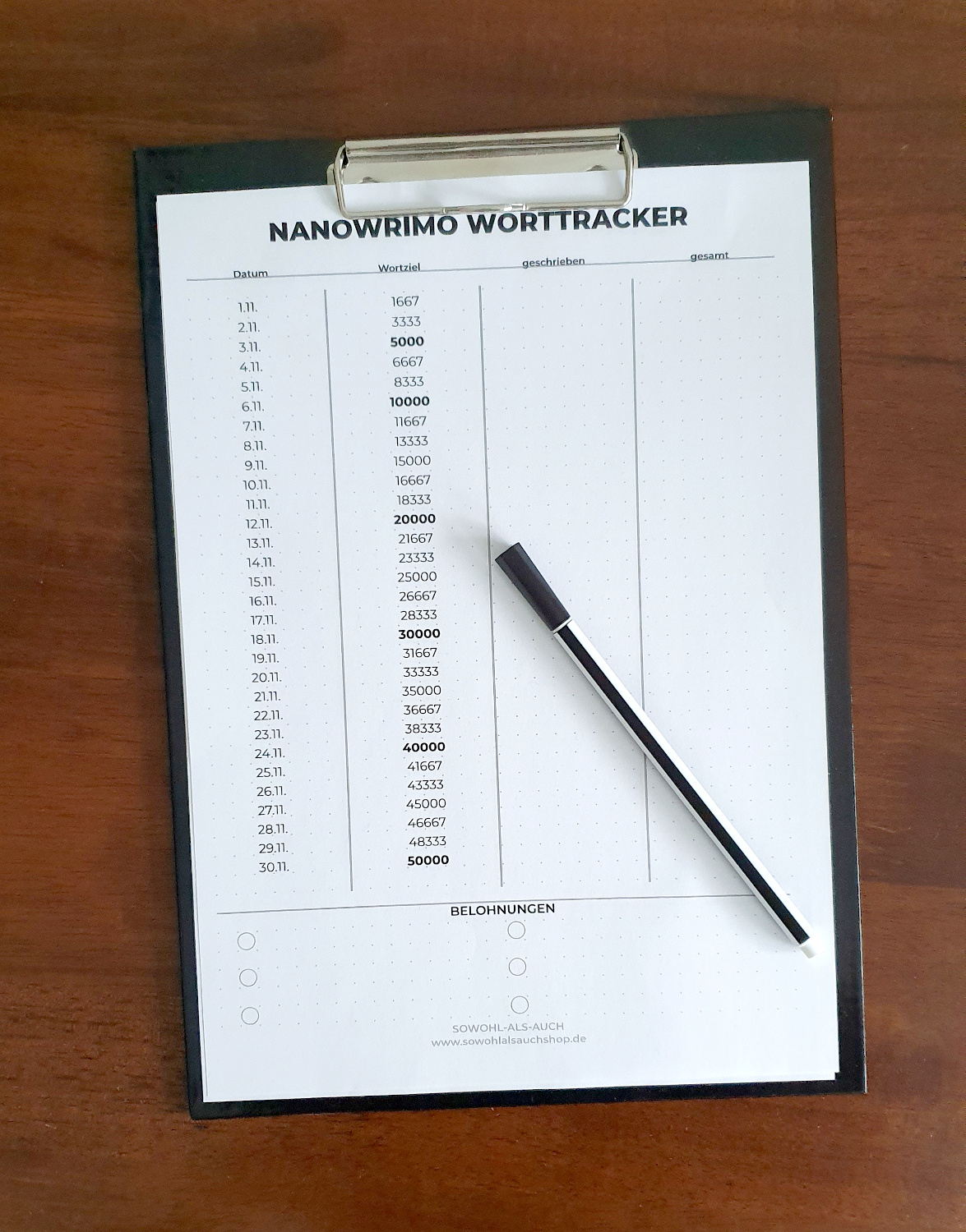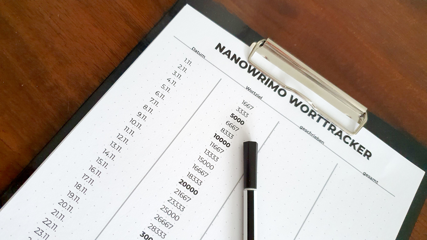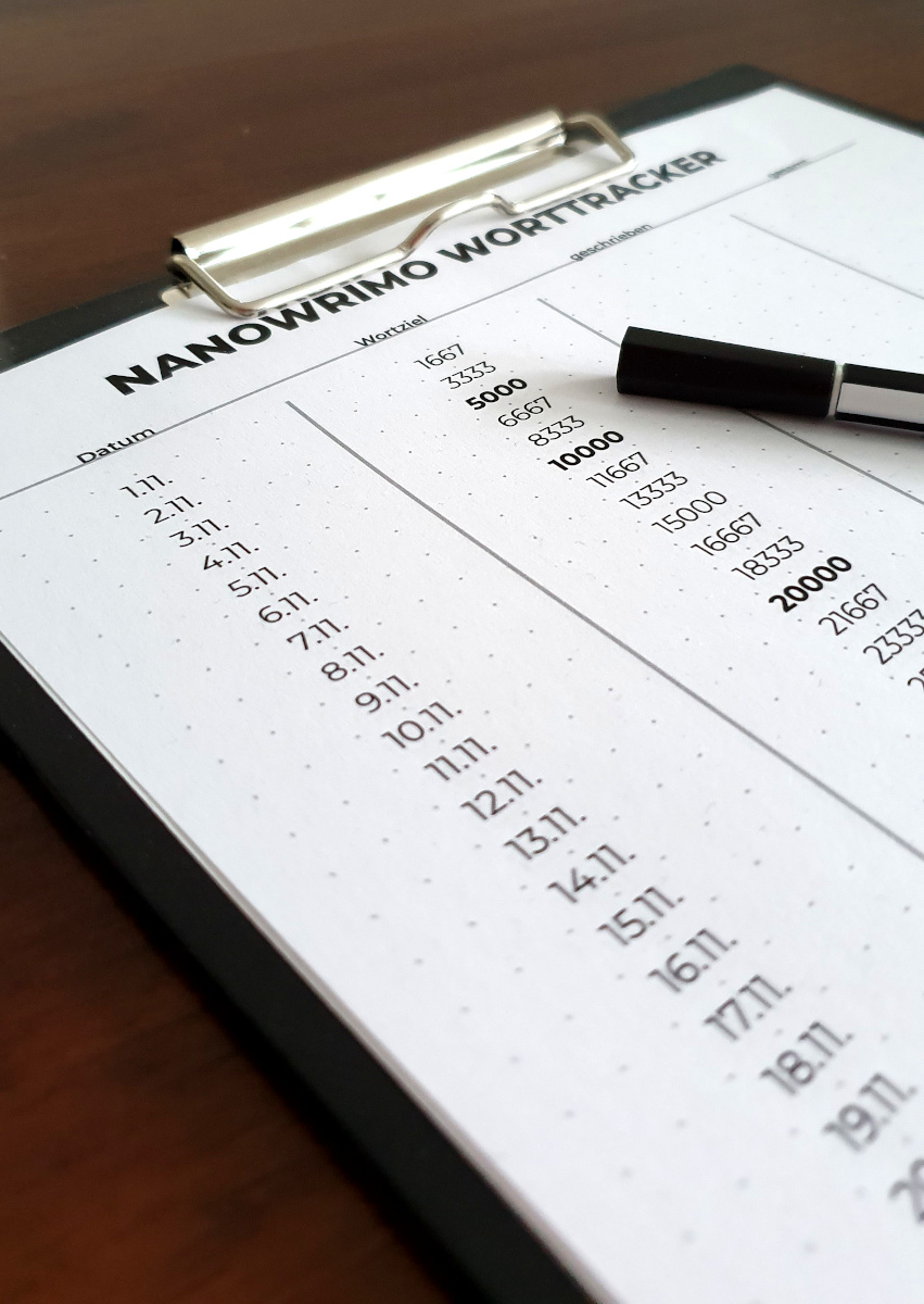 Den Worrtracker gibt es gratis hier: Worttracker Nanowrimo 2019. Einfach ausdrucken und ausfüllen.