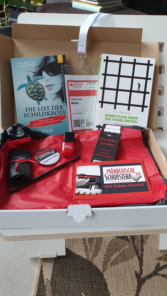 Für die Messe waren die Schwestern noch einmal besonders kreativ: Es gab eine Blogger:innen-Box. Und diese enthielt zwei Bücher (immer eine Überraschung, da es aus dem gesamten Pool der neuen Veröffentlichungen der Schwestern war). In meiner waren drin: Elisabetta Fortunato, Die List der Schildkröte und Anja Mäderer, Einer flog über die Vogelsburg sowie einen passenden blutroten, gebrandeten Nagellack und einen mörderisch spitzen Bleistift. Die Liebe zum Detail spürte man im Stand und in der Box.