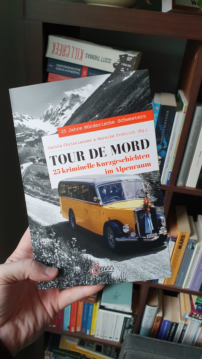 // Carola Christiansen, Mareike Fröhlich (Hrsg.), Tour de Mord – 25 Kriminalgeschichten im Alpenraum. Servus Verlag 2021, 350 Seiten, ISBN: 9783710403033.