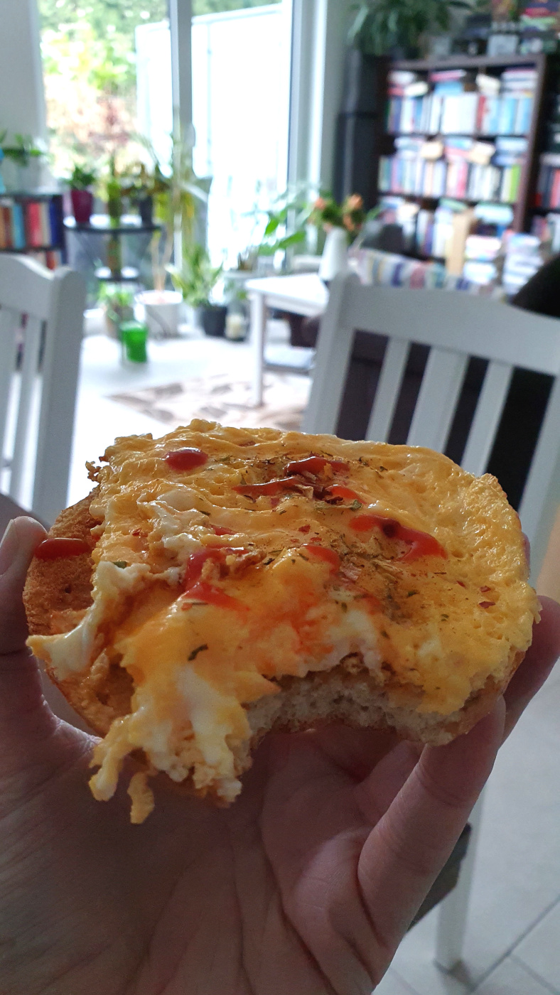 3. Schließlich war die Kolumne online, die Admindinge erledigt und ich konnte mich meinem Frühstück widmen. Heute gab es einen Bagel mit Rührei, das eher ein Omelett geworden ist, aber trotzdem total lecker war.
