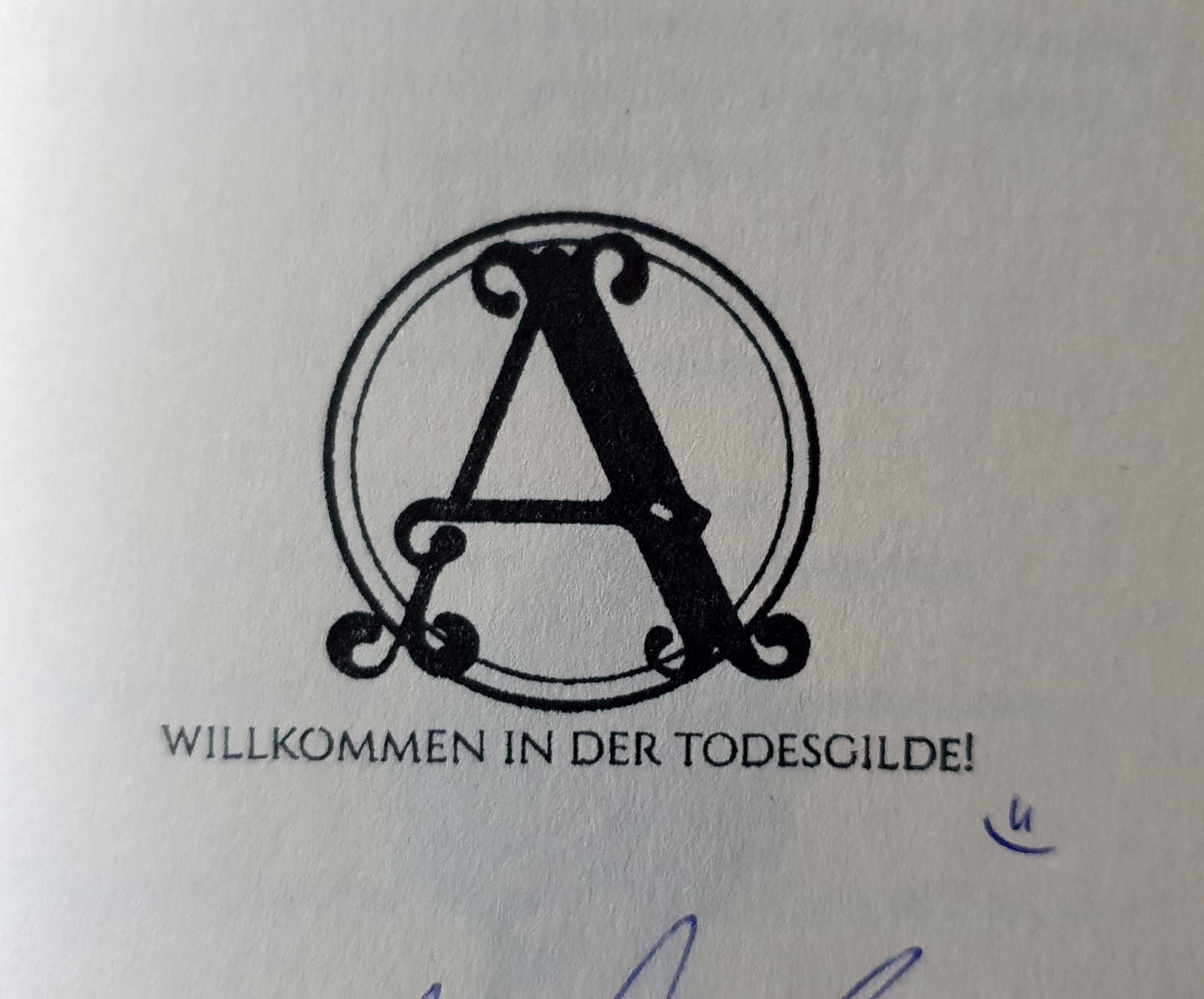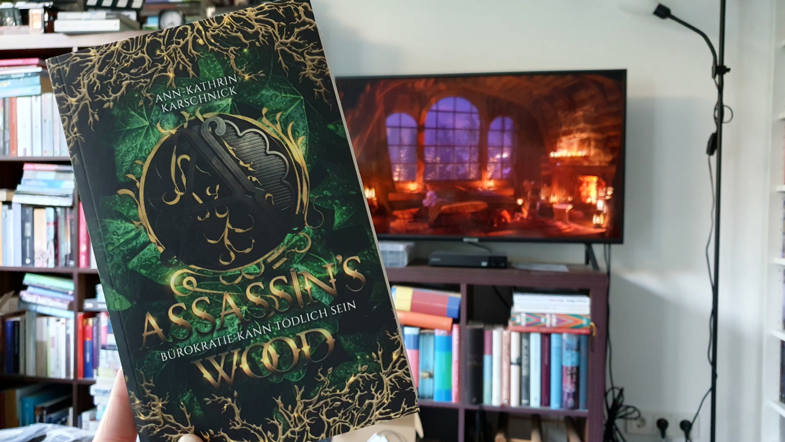 Als nächstes habe ich schnell meinen Lesetracker aktualisiert. Gefolgt von einer Runde Doomscrolling, um eine Serie oder einen Film auf Netflix zu finden, die mich heute Abend anspricht. Dabei war ich leider nicht erfolgreich. Also bin ich wieder zu YouTube und einem Regen/Kamin-Ambience-Video hinübergehüpft und habe ein neues Buch angefangen. Es ist „Assassin’s Wood“ von Ann-Kathrin Karschnick geworden. Es enthält einen Stempel, eine Signatur (nicht im Bild) und wunderbare kleine Illustrationen. Das ist Wurzel, der Bonsai. Das erste Kapitel machte direkt Lust auf mehr.