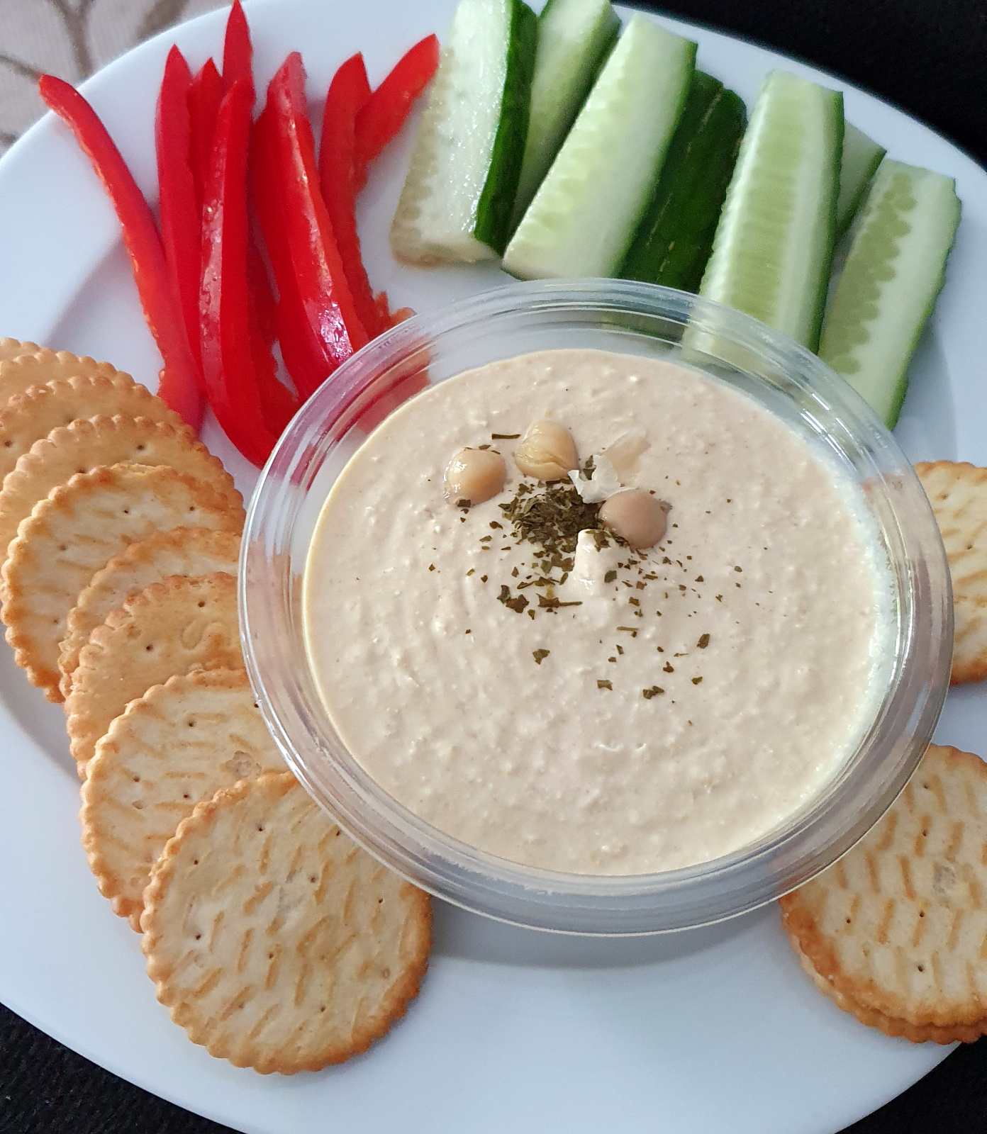 - Ein schnelles Mittagessen. Ich hatte keine Lust zu groß zu kochen: Hummus, Cracker, Paprika und Gurke.