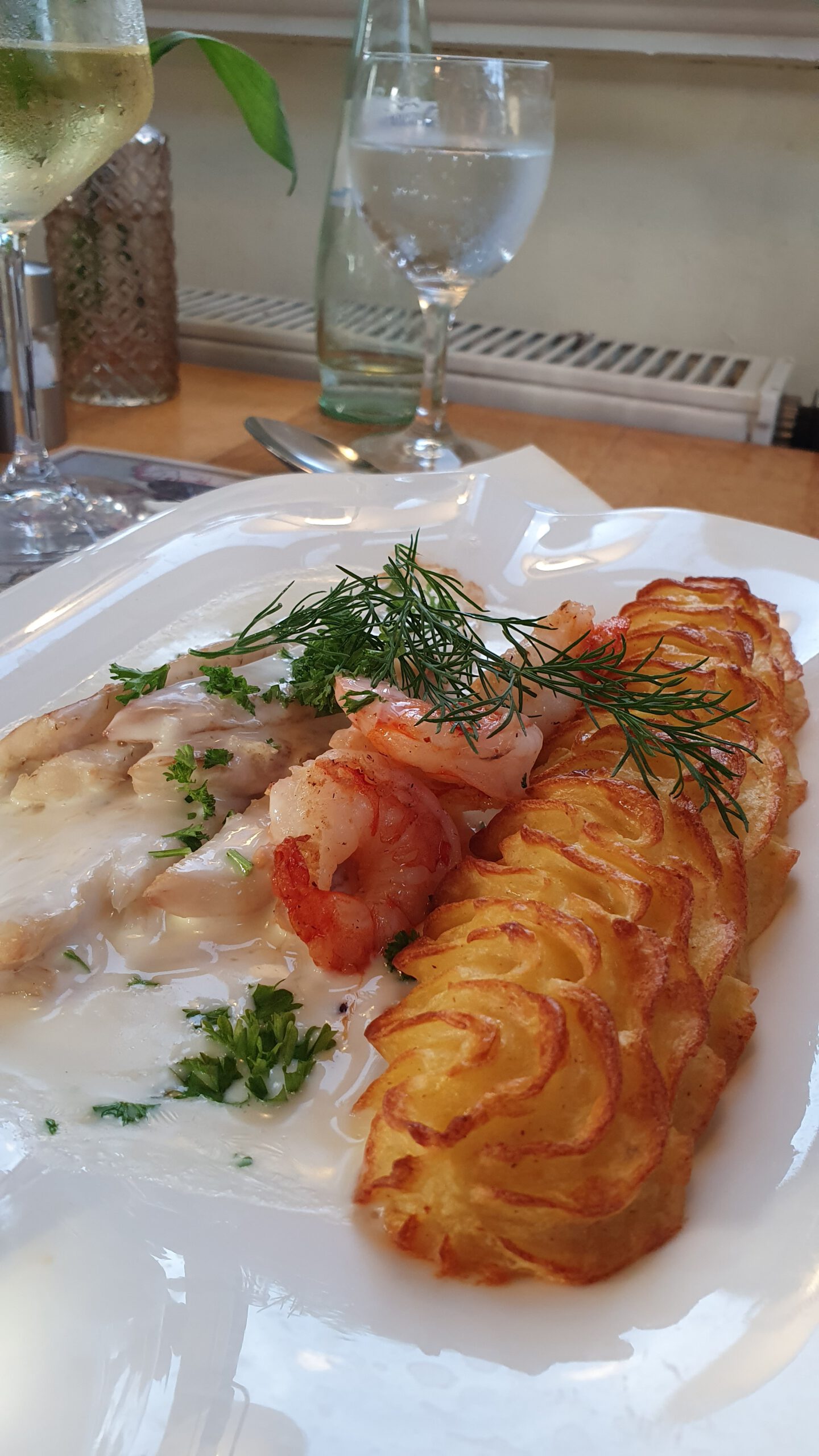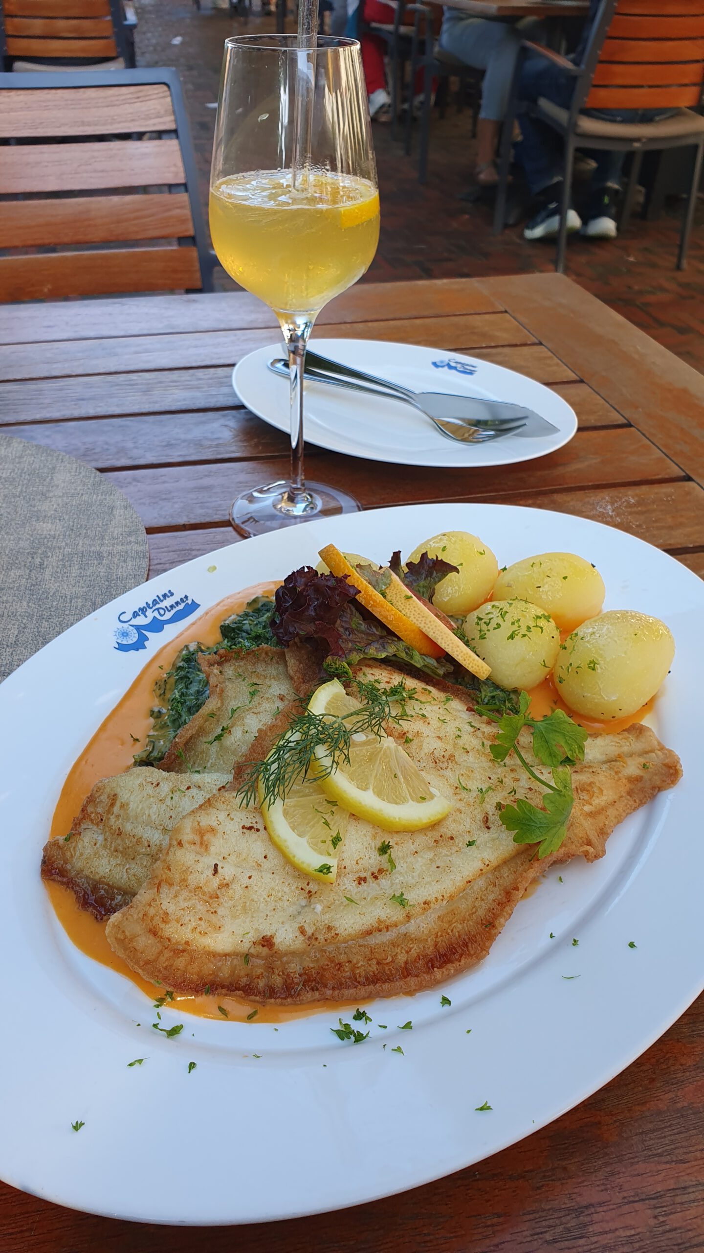 Essen: Sehr gutes Essen und wirklich sehr große Portionen. Als Aperitif empfiehlt sich der Anderlöh Spritz, das ist Getränk ähnlich zum Aperol Spritz allerdings mit Sanddornlikör hergestellt. Als Hauptgang gab es: Frisches Nordseeschollenfilet auf Spinat mit Rahm, Salzkartoffeln und einer Hummerkrabbensauce. Sehr sehr lecker und sehr reichlich.