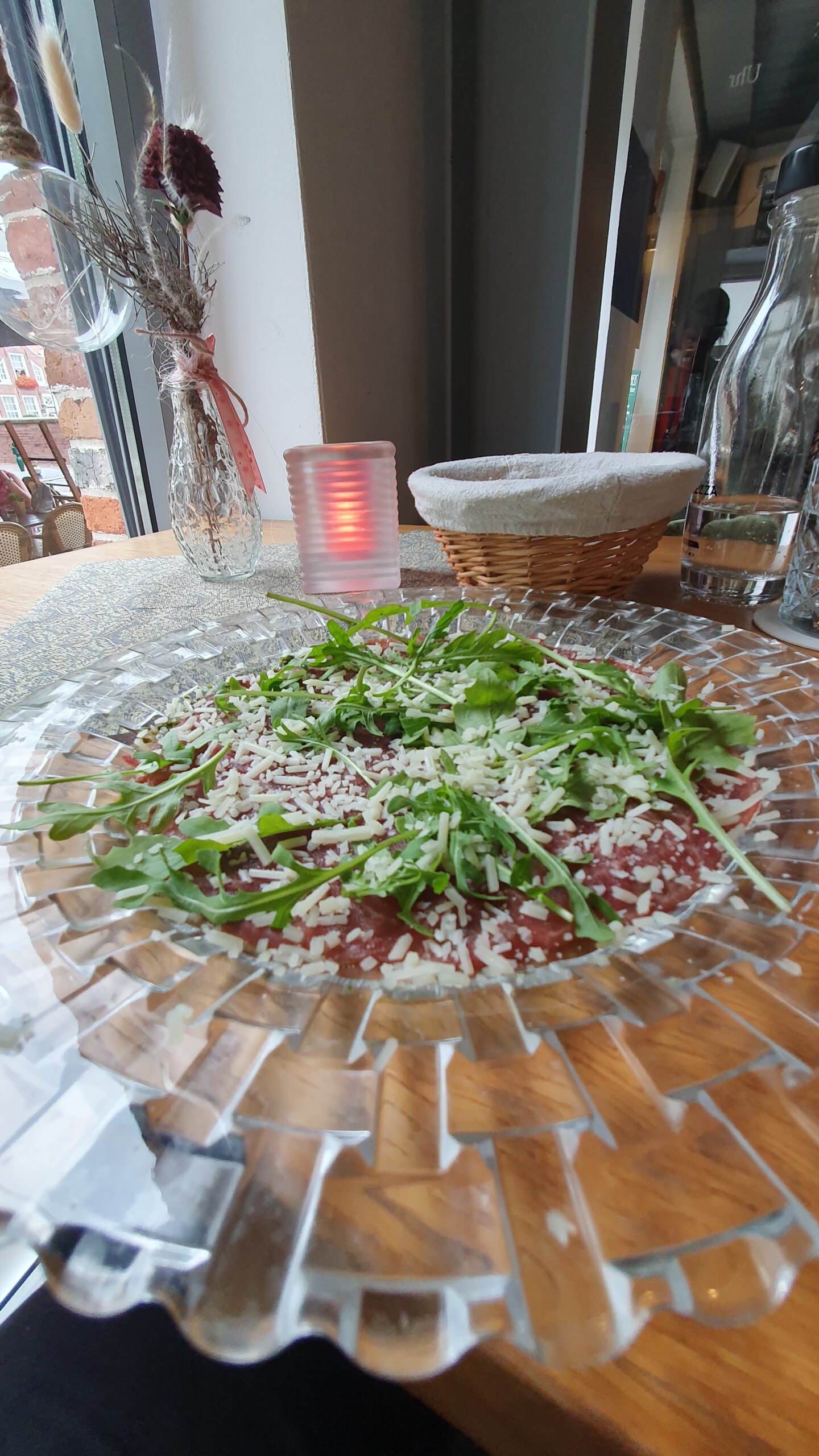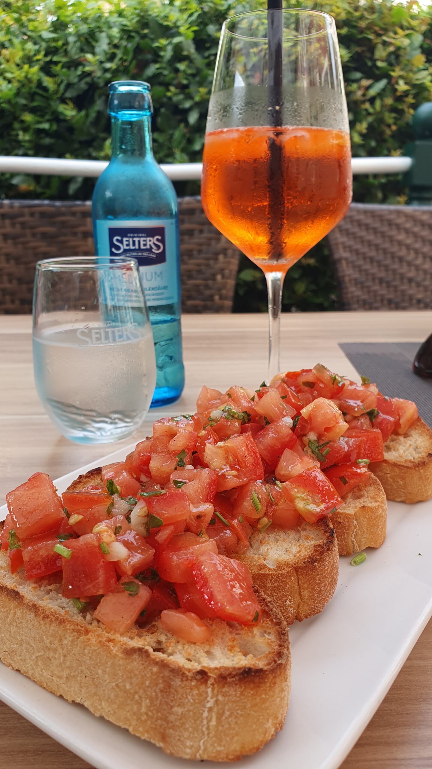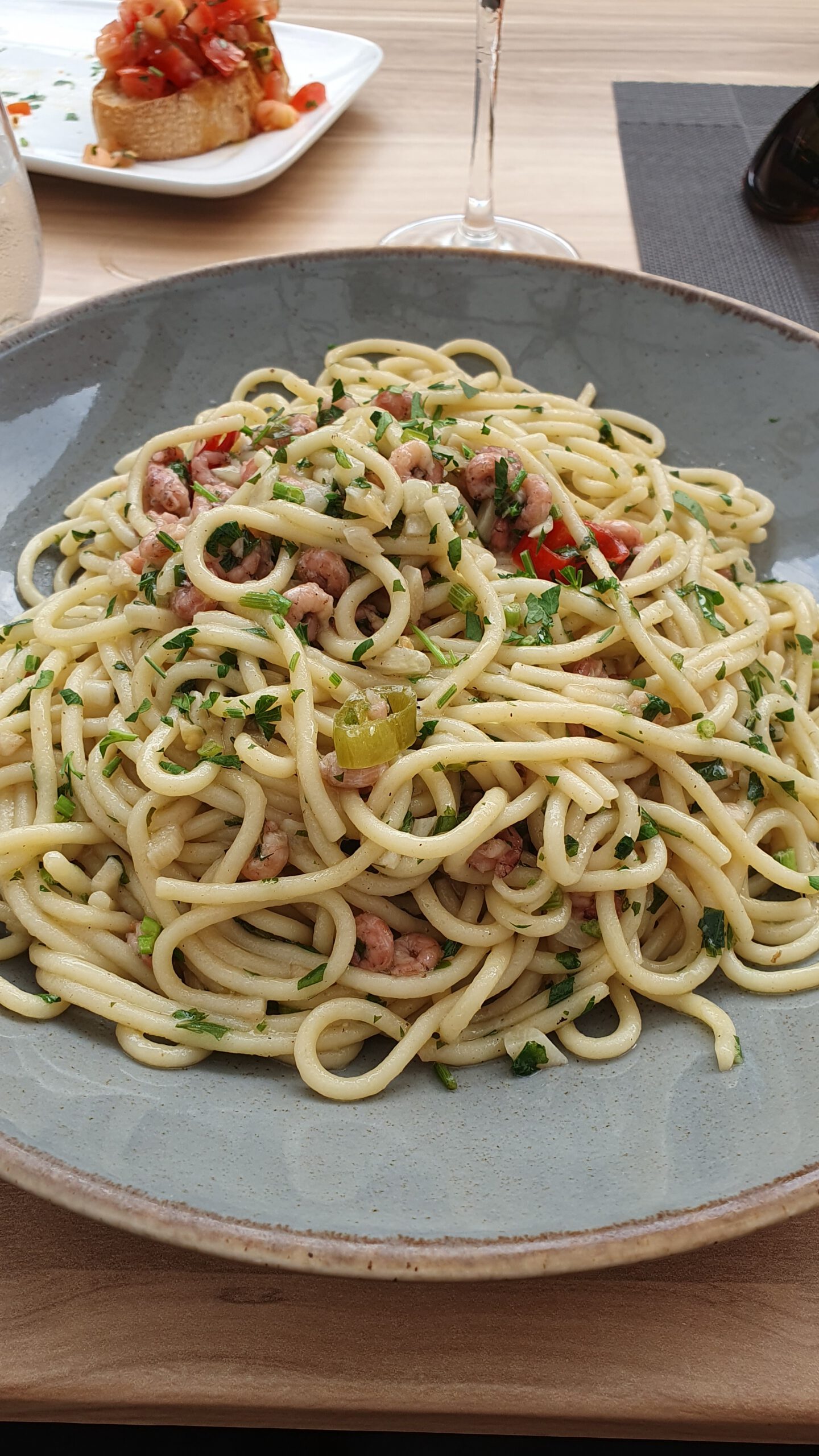 Essen: Als Vorspeise gab es die klassische Bruschetta und als Hauptgang die Spaghetti Greetsiel, d.h. mit Nordseekrabben in einer Chili-Knoblauch-Sauce. Beides war sehr lecker.