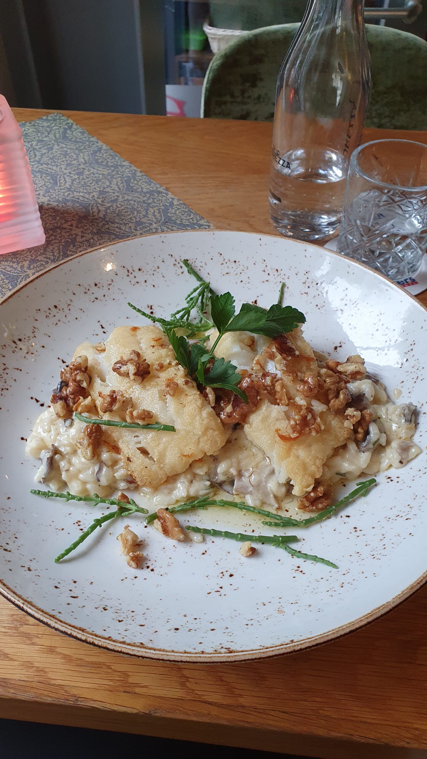 Essen: Sehr sehr gutes Essen! Sowohl die Vorspeise überzeugte (Rindercarpaccio auf Pesto mit Parmesan), wie auch der fantastische Hauptgang (Kabeljau Loin auf Edelpilzrisotto und Walnussbutter), dazu wurde der Weißwein Frischer Wind empfohlen, der wirklich hervorragend gepasst hat.