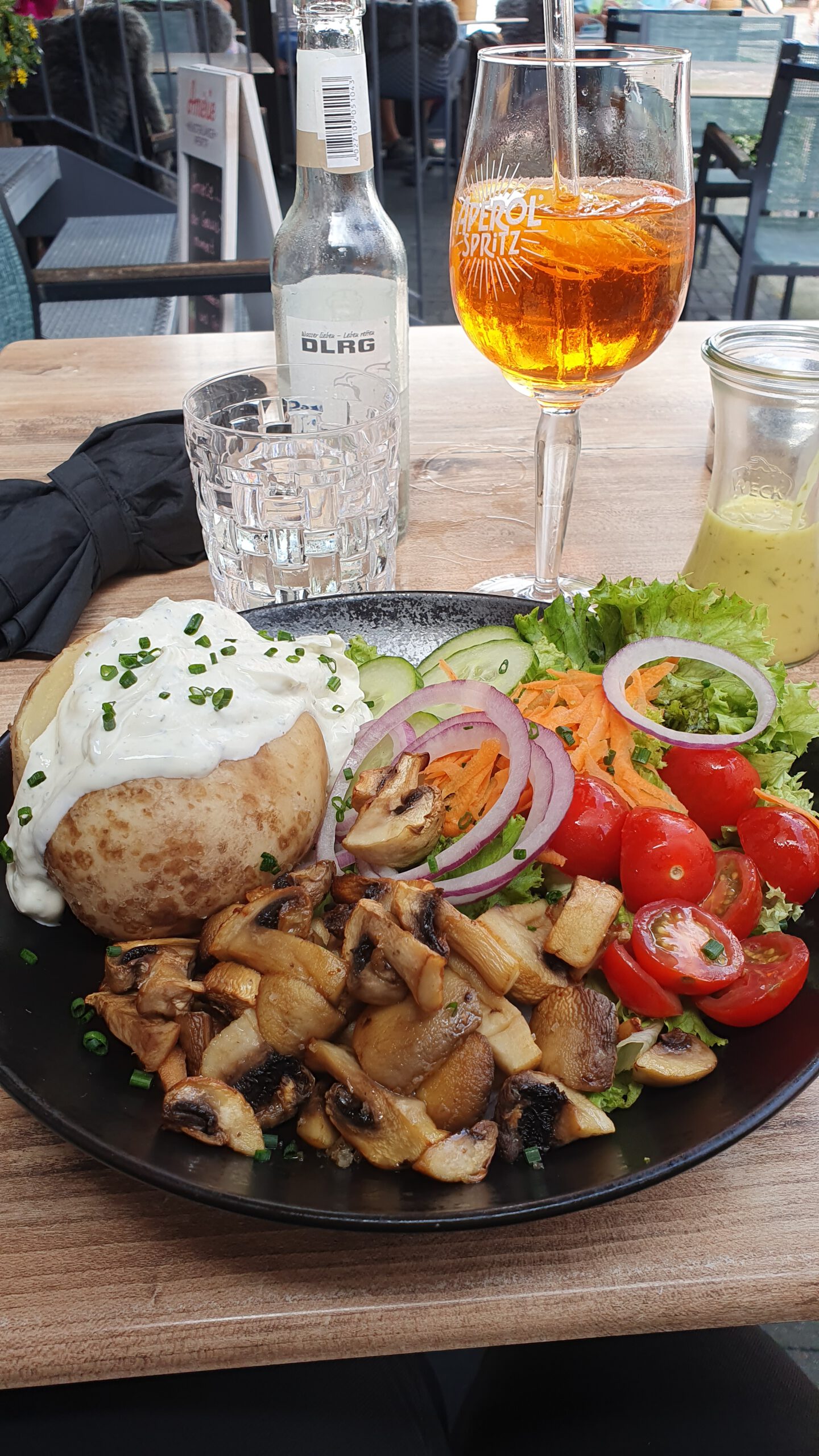 Essen: Auch hier wollte ich zunächst nur was trinken, der Teller, der dann an den Nebentisch gebracht wurde, sah allerdings wieder so lecker aus und da es praktischerweise gerade Essenszeit war, konnte ich mich nicht zurückhalten. Eine riesige Ofenkartoffel mit Kräuterquark, Pilzen und Salat wurde mir dann kurze Zeit später ebenfalls serviert. Sehr lecker.